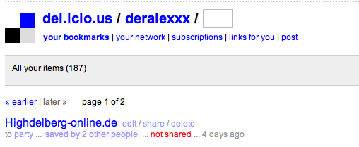 Man kann auch im del.icio.us Netz nach Seiten mit einem bestimmten Tag suchen, was in bestimmten Fällen qualitativ bessere Ergebnisse als herkömmliche Suchmaschinen bringen dürfte.