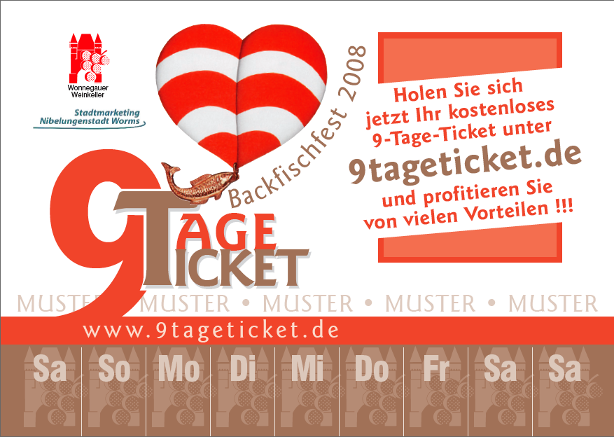 Backfischfest, das größte Weinfest am Rhein wird in diesem Jahr vom 30.08.2008 – 07.09.2008 in Worms stattfinden. Dabei wird ein Brauch dieses Jahr zum ersten mal offiziell: das 9 Tage Ticke.