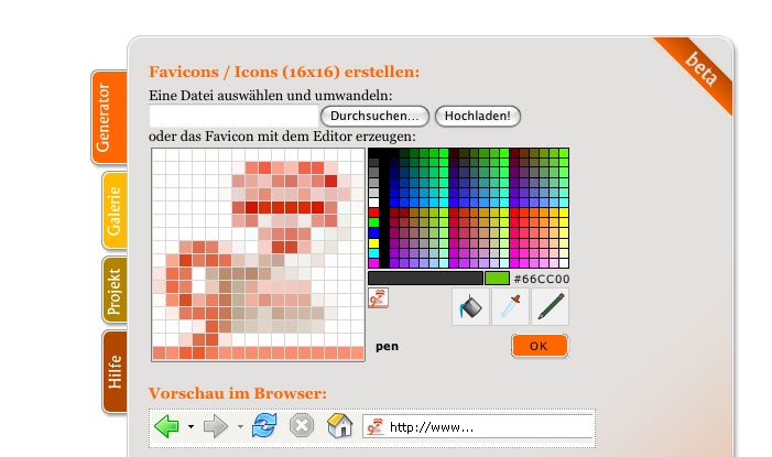 Favicon/Icon Generator und Online-Editor kurz und bündig, ein toller Service: JPEG hochladen und daraus ein webfähiges icon erzeugen lassen und direkt downloaden.