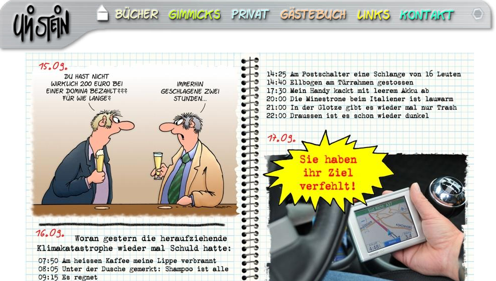 Für den kleinem Lacher zwischendurch bin ich durch Zufall auf das Notizbuch von Uli Stein gestossen. Uli Stein ist ein, wenn nicht sogar der bekannteste Cartoonist Deutschlands. Kaum zu glauben,dass der hauptsachlich durch Tiercartoons bekannte Zeichner in seiner Schulzeit in Kunst keine guten Zensuren hatte. Zu bestaunen sind seine Werke in mehren Büchern mit millionen Auflage, auf Postkarten die um die Welt gehen und auf diversen mehr oder weniger nützlichen Alltagsgegenstaende. Besonders Mäuse setzt Stein gerne in Szene, um mit kurzen und prägnanten Sätzen witzige Situationen zu beschreiben. In der Einfachheit liegt dabei die Stärke, so ist der Humor für Jung und Alt gleichsam verständlich.
